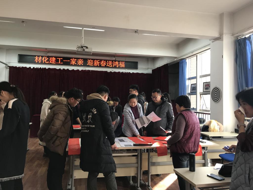 无联不成春,有联春更浓。为弘扬中华优秀传统文化,向广大师生送上温暖祝福。1月17日上午9时,材料与化工学院与建筑与工程学院分工会联合组织的“材化建工一家亲,迎新春送鸿福”的写春联、送祝福活动在2号实验楼543会议室顺利开幕。