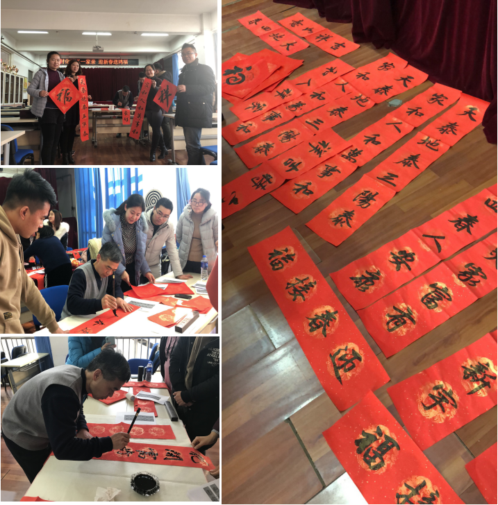 自上午9点至下午4点,活动共持续了7个小时,期间活动室人头攒动,热闹非凡,洋溢着喜庆祥和了节日气氛。据统计仅樊平老师一人就撰写了120余副对联,获得了广大师生的赞许。本次活动不仅寄托了教工们对挥别狗年、喜迎猪年、辞旧迎新的美好愿景,而且唱响了全院上下平安吉祥、和谐发展的励志高歌。