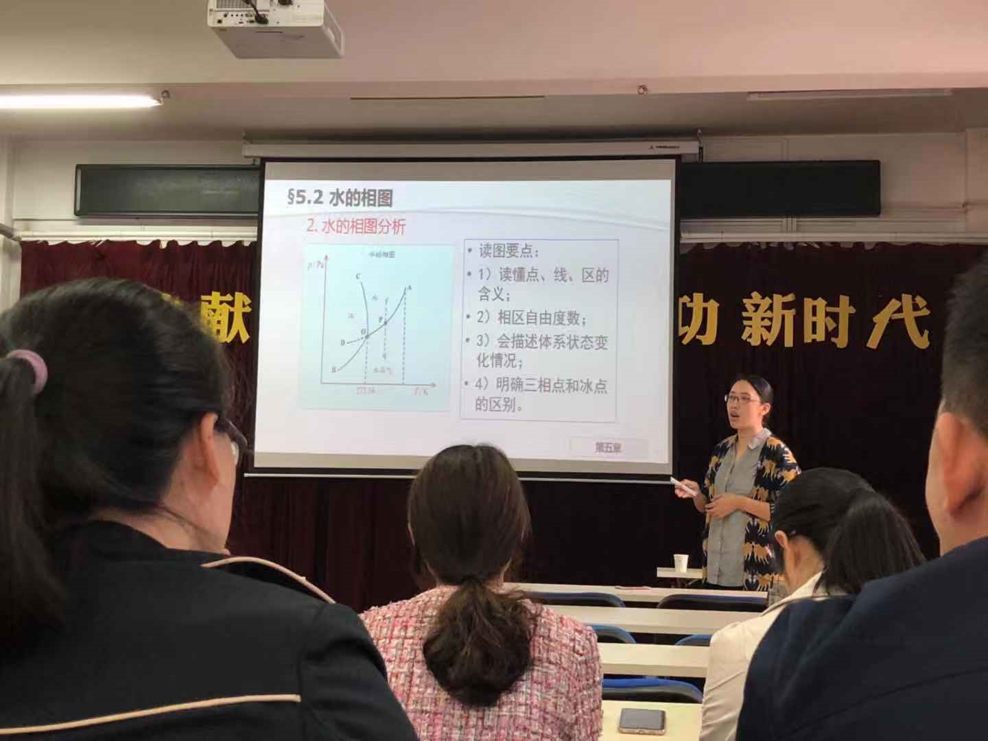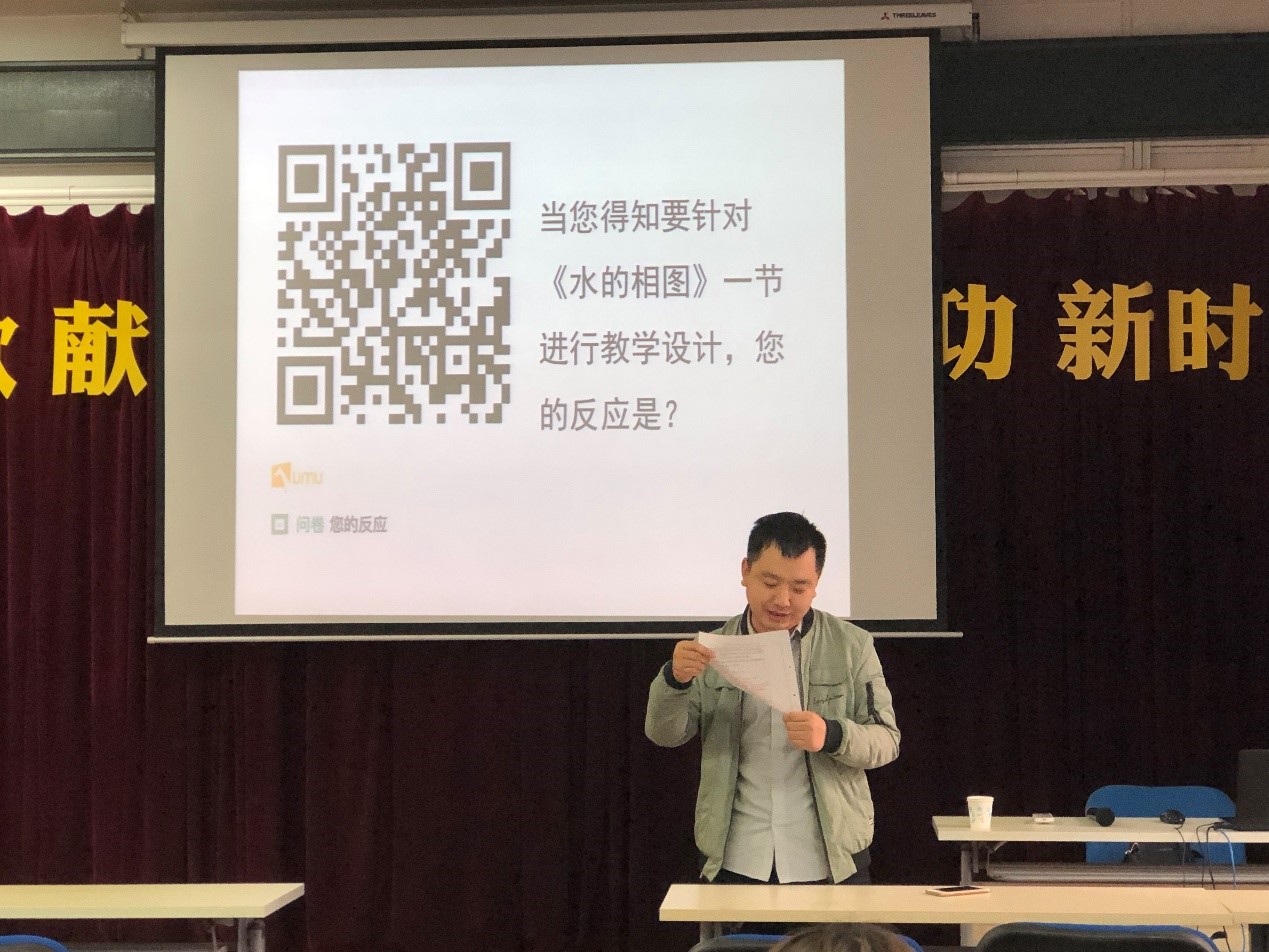 本次教学示范课由我院何方老师主讲。何方老是为我院优秀青年教师,在相关的教学技能大赛中多次拿奖,具有丰富的教学经验以及教学技巧。在本次示范课开始的前奏,何方老是通过调查问卷的形式了解各位老是对教学设计的认识,了解到每一位青年教师的具体情况。通过该调查问卷以及各个老师对《水的相图》所做的课程设计分享等,不仅给大家讲解了教学设计中的所包含的内容,也存在一定活跃课堂气氛的作用,同样使得各位教师明白在给学生授课时,学生对于陌生的概念的反应以及想法等。