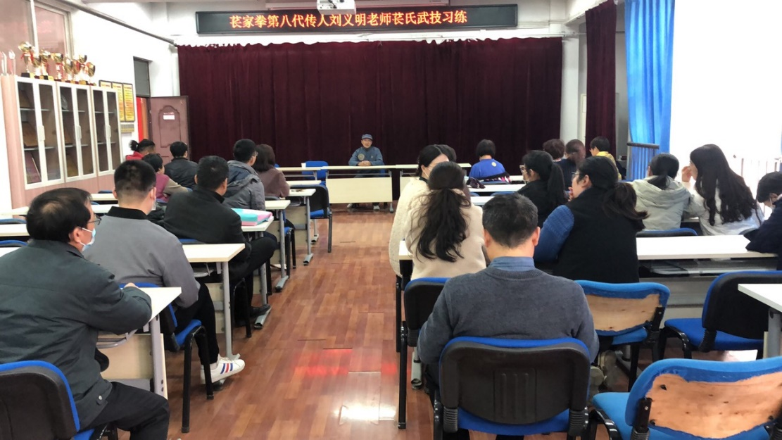 首先,刘义明老师简单讲授苌家拳的拳学源流,风格特点,养生功的心法要义以及即将展演的苌家拳的基本桩功。