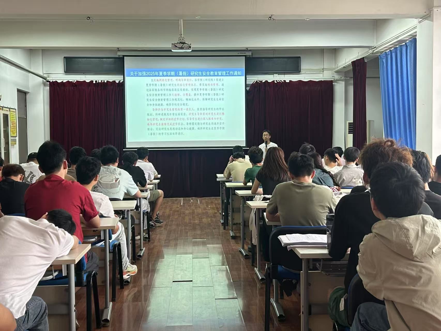 最后,秦琦围绕夏季学期的时间安排、工作要求、在校研究生管理及研究生返校注册等工作提出了明确要求。她还结合我校夏季学期研究生留校管理的相关规定,从研究生日常管理、请销假制度、外出管理、住宿安全、防诈安全、食品安全等方面作了具体说明,强调研究生须严格遵守学校和学院的各项规定,切实提高安全防范意识。