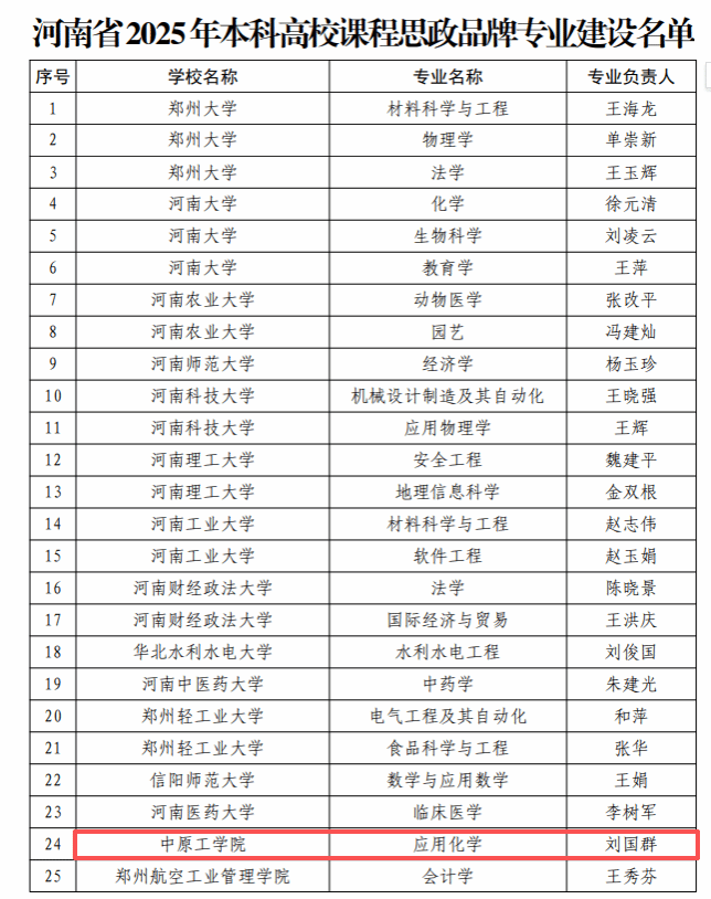 近日,河南省教育厅正式公布《2025年本科高校课程思政品牌专业建设名单》,我院应用化学专业凭借扎实建设成果成功入选,跻身全省50个获评专业行列。这一成绩标志着我院在落实立德树人根本任务、推动课程思政与专业教育深度融合上取得标志性突破。