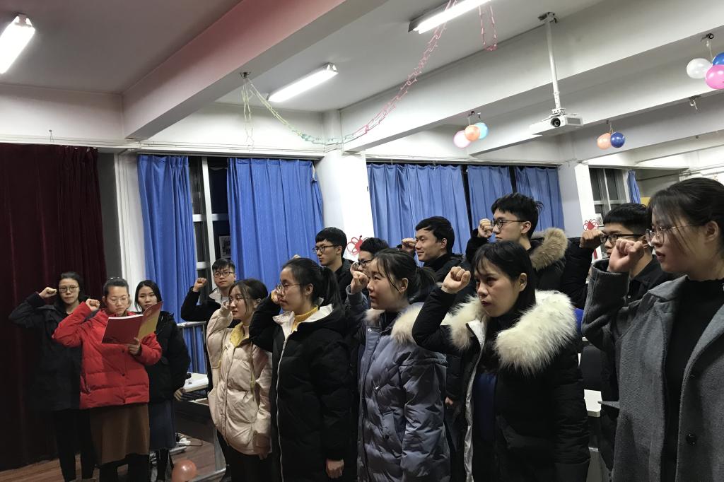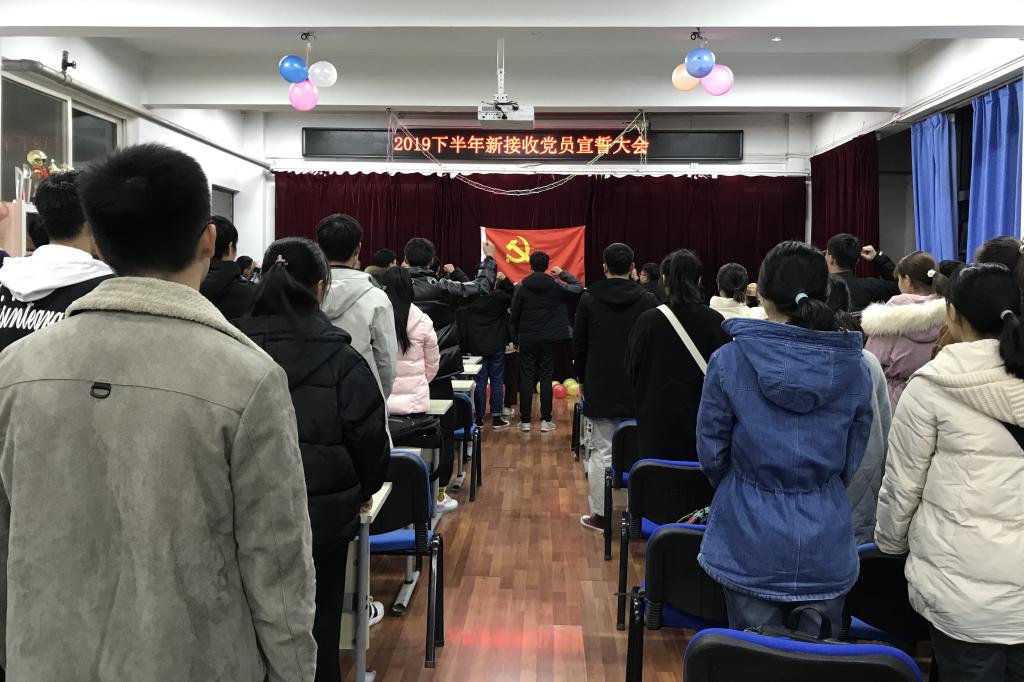 2019年12月18日下午,材料与化工学院在二号实验楼543举行2019年下半年新接收党员入党宣誓仪式,参加会议的有材科专业学生党支部书记艾文英以及全体学生党员,会议由应化专业学生党支部书记洪潇主持。
