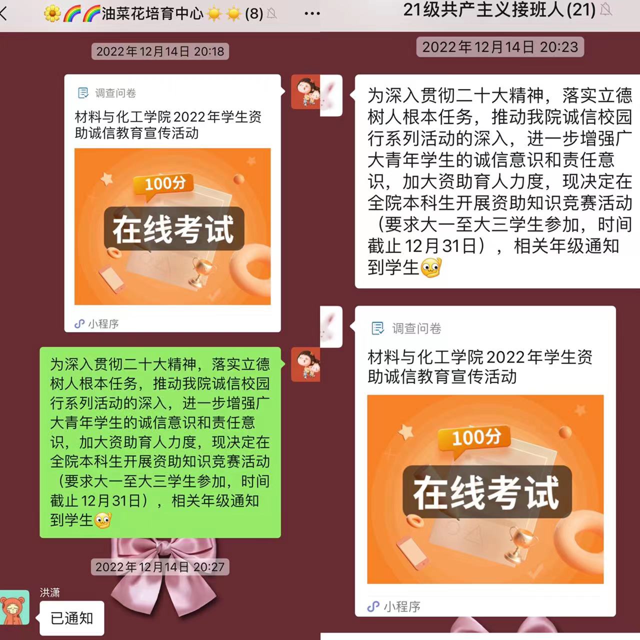 2022年12月14日至31日,材料与化工学院组织开展了为期18天的“线上学生资助政策知识竞赛” 活动,我院大一至大三本科生先后参与了此次竞赛。