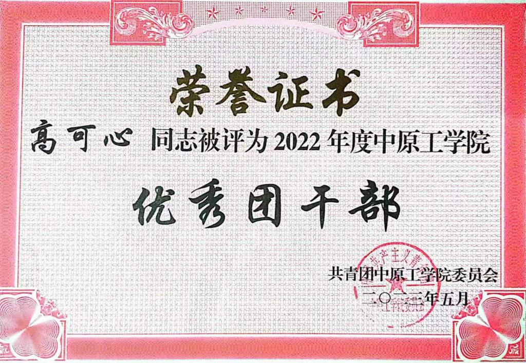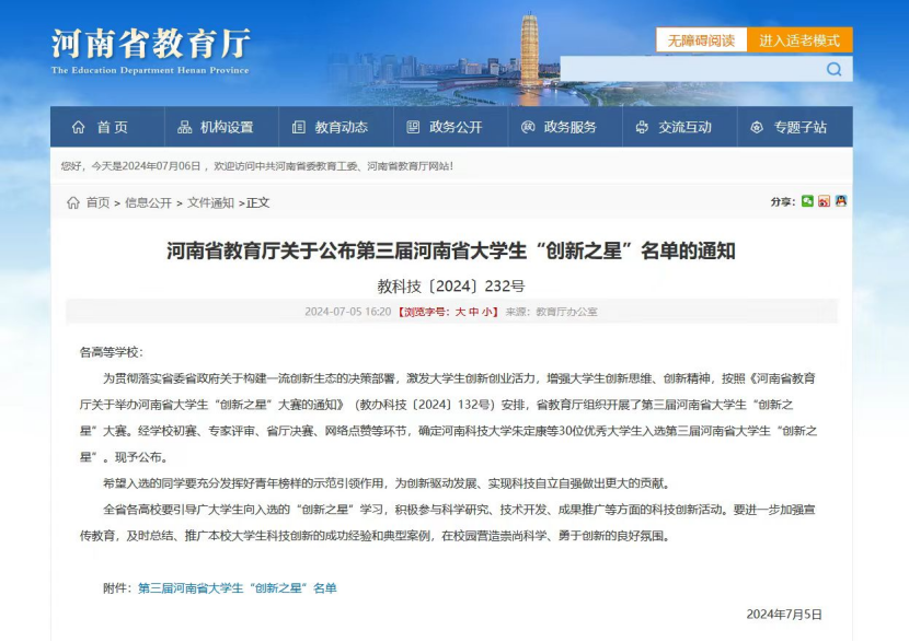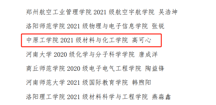 近日,河南省教育厅正式公布了第三届河南省大学生“创新之星”名单。经学校初赛、专家评审、省厅初赛、网络点赞等环节,我院2021级应用化学专业本科生高可心同学成功入选。