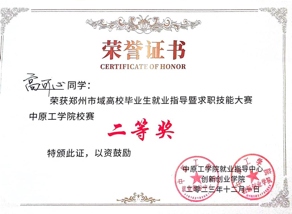 郑州市求职技能大赛英国威廉集团校赛二等奖