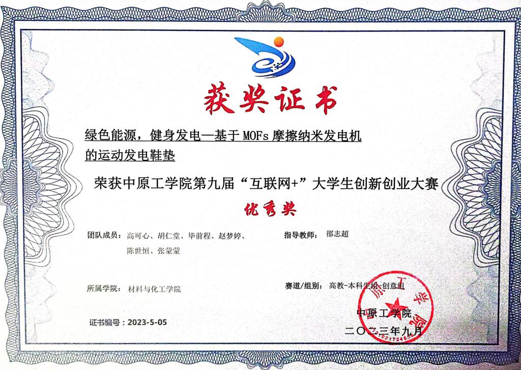 她注重实践与知识的结合,勤奋刻苦,成绩优异,表现突出,从入学开始一直致力于新型摩擦发电材料的设计研发展开研究,日积月累取得了优秀的科研成果。共发表SCI高水平论文7篇,第一作者刊发论文一篇。另外作为负责人,主持完成了河南省大学生创新创业训练计划项目1项,申请国家发明专利6项(授权4项)。