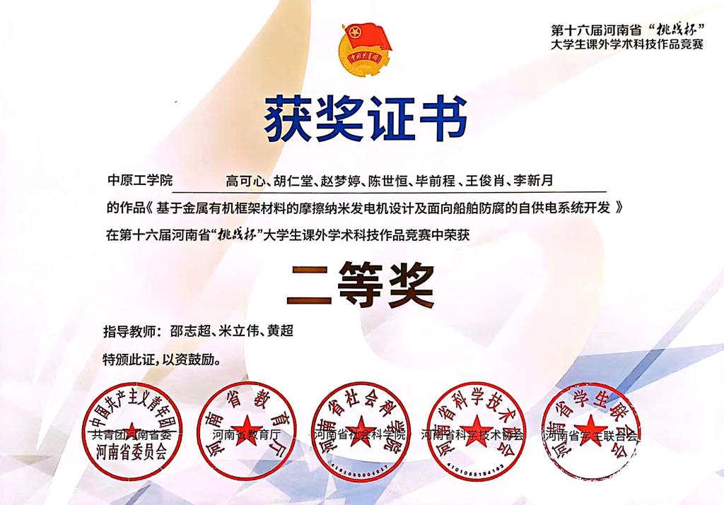 河南省“挑战杯”大学生课外学术科技作品竞赛二等奖