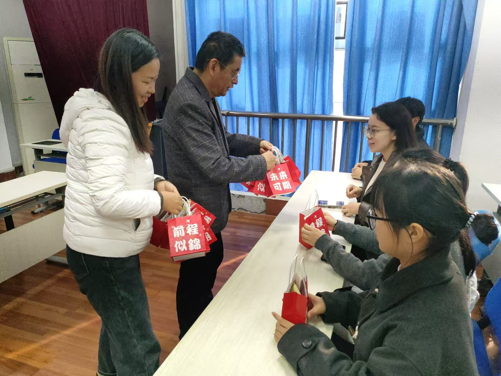 活动最后,学院领导和各位老师向考研学子赠送了精心准备的考研专属礼包。这份礼包不仅满载着独特的象征意义与美好的祈愿,更深蕴着学院对考研学子无限的祝福与期待。希望每一位即将踏上考场的学子都能金榜题名,未来之路如锦绣般绚烂辉煌!