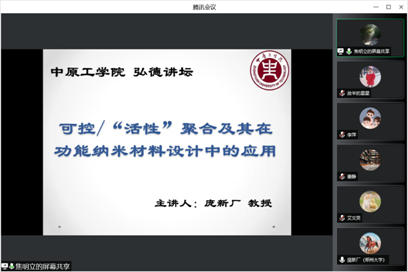 518日上午,应我校科技处、材料与化工学院和先进材料研究中心邀请,郑州大学材料科学与工程学院教授、博士生导师、执行院长、河南省特聘教授庞新厂教授在腾讯会议上作了题为“可控/“活性聚合及其在功能纳米材料设计中的应用”的学术报告。报告会由材料与化工学院副院长焦明立教授主持,材料与化工学院、先进材料研究中心及其他院部百余名师生聆听了本次报告。