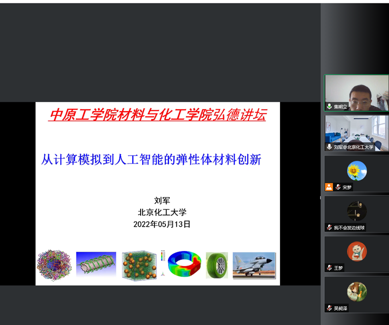 2022年513号上午,应我校科技处、材料与化工学院和先进材料研究中心邀请,北京化工大学人工智能交叉研究中心博导、国家优秀青年基金获得者刘军教授以“从计算模拟到人工智能的弹性体材料创新”为题,为材料与化工学院、先进材料研究中心及其他院部百余名师生做线上专题学术报告。报告会由材料与化工学院副院长焦明立主持。