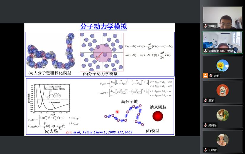 报告会上,刘军教授首先介绍了弹性体材料的应用现状及面临的科学问题,然后,围绕弹性体-纳米颗粒复杂体系,从计算模拟方法的发展与构建、弹性体纳米复合材料计算模拟设计、类玻璃弹性体材料计算模拟设计以及弹性体及其复合材料人工智能设计四个方面做了深度讲解。报告结束后,我院师生同刘军教授进行了更深入的交流和探讨。
