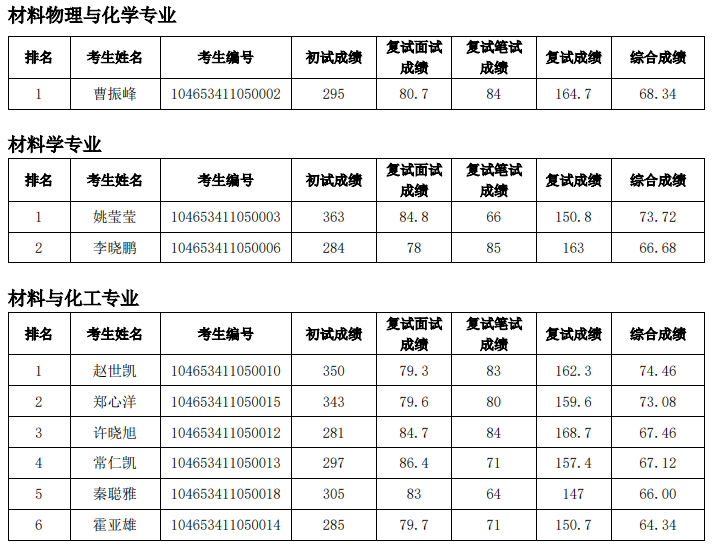 按照学校研究生招生工作安排,材料与化工学院2023年硕士研究生复试工作(第一志愿考生)于4月4日进行,根据复试情况,现对考生综合成绩进行公示: