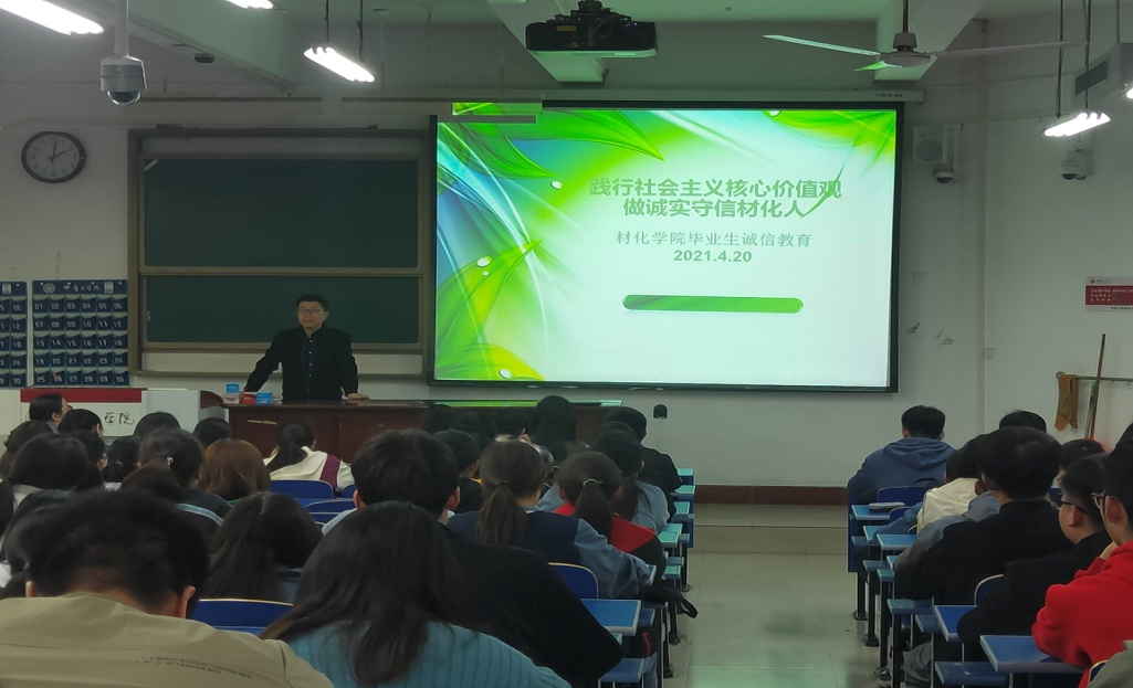 邢老师通过介绍国家诚信系统一体机制、身边曾发生的实例和社会上部分知名人士被列入失信名单等征信红字的反面案例,告诫我院学生一定要诚实守信,莫要捡了芝麻丢了西瓜。希望同学们珍惜个人信用记录,积极履行个人还款义务,在毕业后保持和学校、老师的密切联系,争做诚实守信的中工人、材化人。