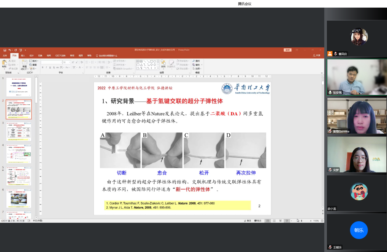 此次讲座丰富了我校师生在疫情防控期间的学术生活,营造了浓厚的学术交流氛围,拓展了广大师生对超分子弹性体、超分子作用的认识,扩宽了广大师生在分子结构设计和功能材料领域的研究思路。(通讯员:曹凤仪)