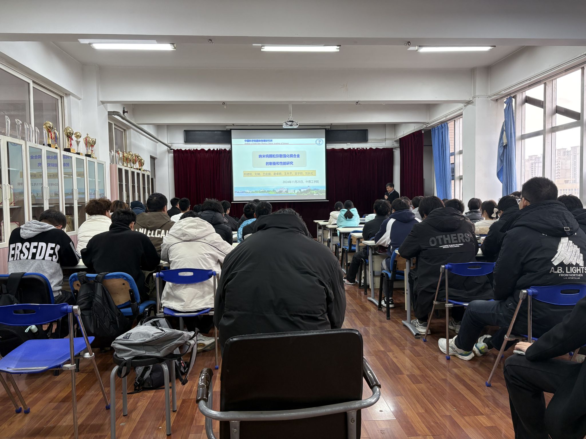 方前锋研究员作题为“纳米钨颗粒弥散强化铜合金的制备和性能研究”的学术报告。报告从当前国内外高性能铜合金材料的科研发展趋势及面临的困难等方面展开,详细介绍了低体积分数纳米W颗粒均匀分散的Cu-W合金块体材料,解决了铜合金强度、导热性能和高温稳定性三者之间相互制约的难题,实现了高强度、高热导率及高温稳定等综合性能铜合金材料在先进核能、高速轨道交通、电子芯片、强电磁等领域的重要应用。报告内容丰富、科学性强,拓宽了师生的学术视野。交流环节,专家同与会师生就高性能铜合金的开发与设计及其在电子信息材料方面应用等问题进行了深入的探讨与交流,现场气氛热烈,学术氛围浓厚。