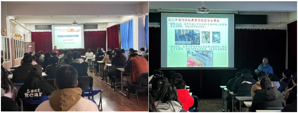 会上,朱根兴老师首先强调了开展本次毕业设计实验室安全培训的目的和意义,随后介绍了材料实验测试中心下属教学实验室和教师科研实验室的基本概况,并通过近几年国内高校典型实验室安全事故的案例讲解,结合实际数据和图片内容,详细分析了事故发生的具体原因,希望通过这些惨痛的事故案例,能引起同学们对实验室安全的高度重视。最后,朱根兴老师又详细讲解了进入实验室开展毕业设计实验的有关重点注意事项,并告诫全体学生一定要牢固树立实验室安全意识,进入实验室必须严格遵守学校、学院的安全管理制度和实验室准入制度,认真学习安全常识和必备技能,在保证生命、财产安全的前提下圆满完成毕业设计,顺利毕业。